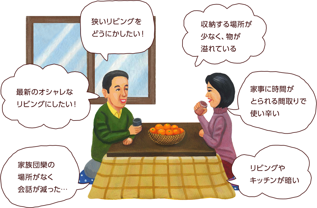 リビングが狭く、家族団欒の場所が確保できない。生活動線の良い広々としたLDK空間にしたい。